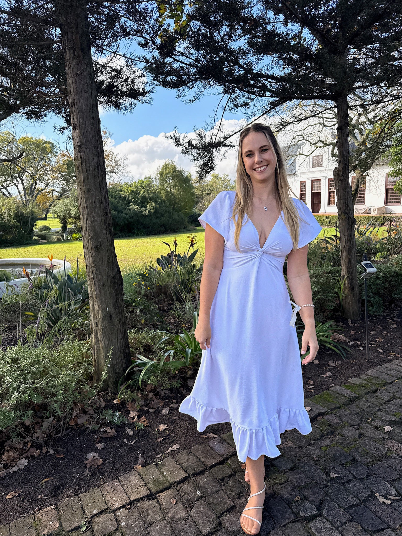 A charming and feminine midi dress featuring a low V-neckline with a knotted detail at the center bust. The sleeves gently flare for a soft touch, while the gathered bottom adds movement and flow to the dress.
